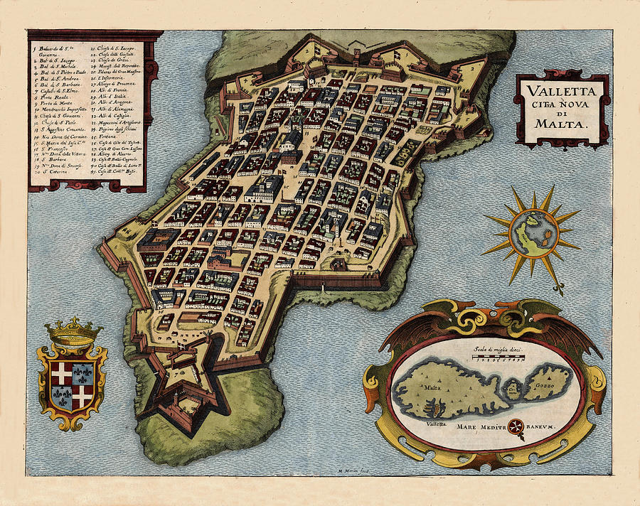 Éditeur / Graveur : Matthäus Merian Gravure sur cuivre 33 x 38 cm, imprimé à Francfort vers 1638. La gravure représente une vue cartographique de La Valette accompagnée d’une légende à 41 points, publiée dans l’ouvrage Topographia de M. Merian. Un cartouche orné contient une carte de Malte et de Gozo, tandis qu’une rose des vents indique la position de Malte par rapport à l’Italie et à la Sicile. La Prigione dei Schiavi est visible vers le centre gauche de l’image, el